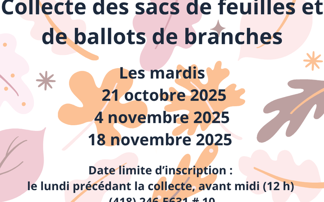21 octobre, 4 novembre et 18 novembre 2025 Collectes de sacs de feuillets et de ballots de branches