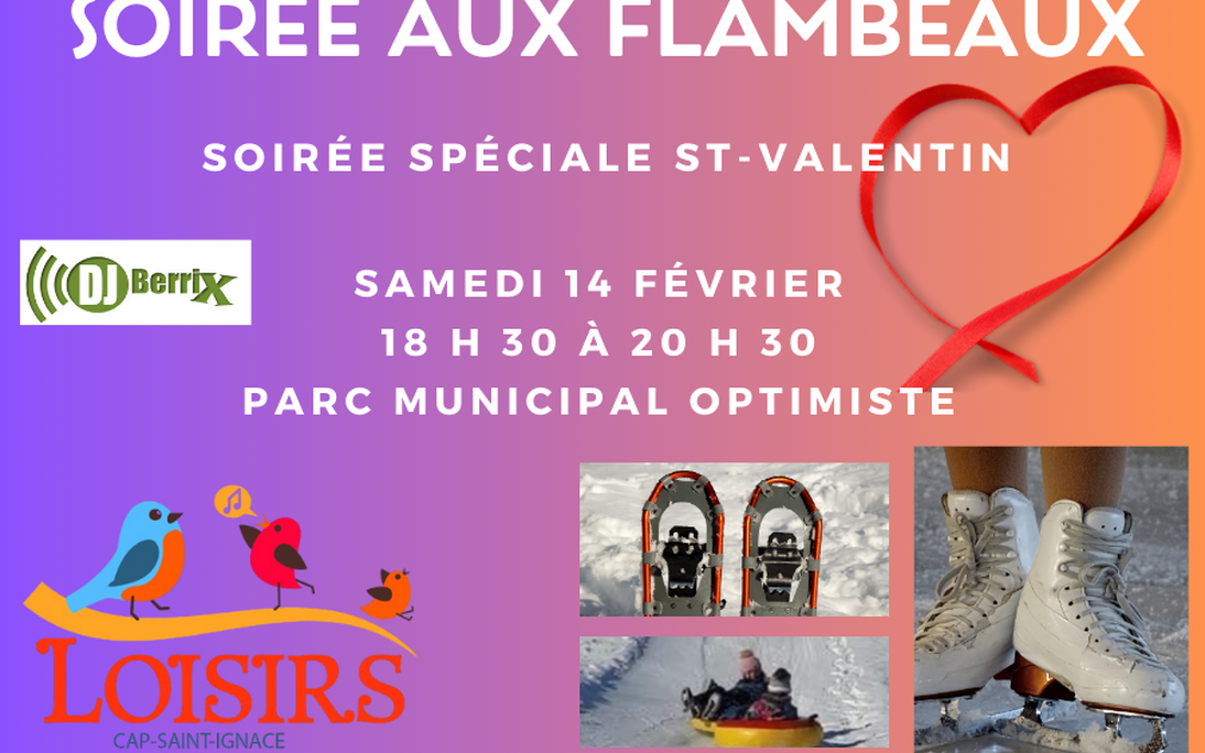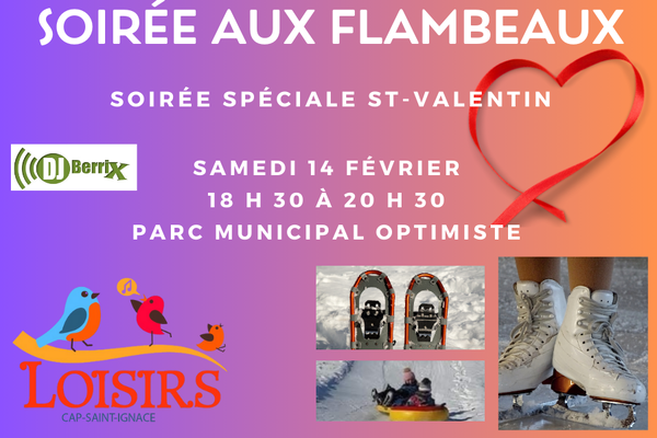 Soirée aux flambeaux | Le samedi 14 février 2026 | De 18 h 30 à 20 h 30 | Parc municipal Optimiste | Feu (guimauves et saucisses |Surprises chocolatées pour les enfants | Châteaux de neige colorés