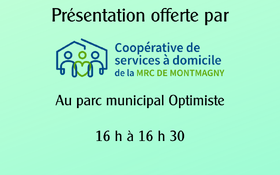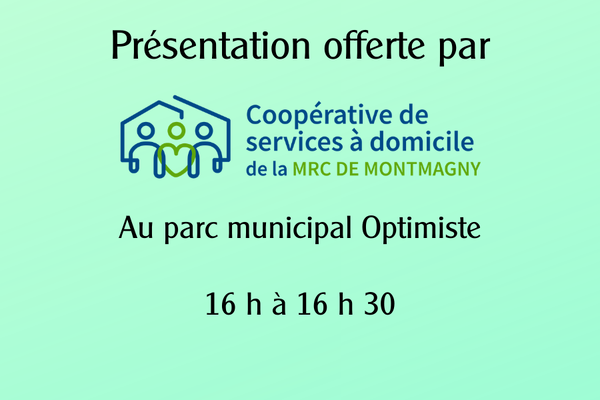 La Coop de services à domicile organise une présentation le mardi 17 mars 2026, de 16 h à 16 h 30 au parc municipal Optimiste de Cap-Saint-Ignace portant sur des services et programmes d'aide financière pour faciliter l'accès aux services aux aînés, personnes retraitées, en perte d'autonomie (temporaire ou permanente), personnes à mobilité réduite, ainsi qu'aux familles et proches aidants. Des exemples de calculs seront présentés au cours de la rencontre.